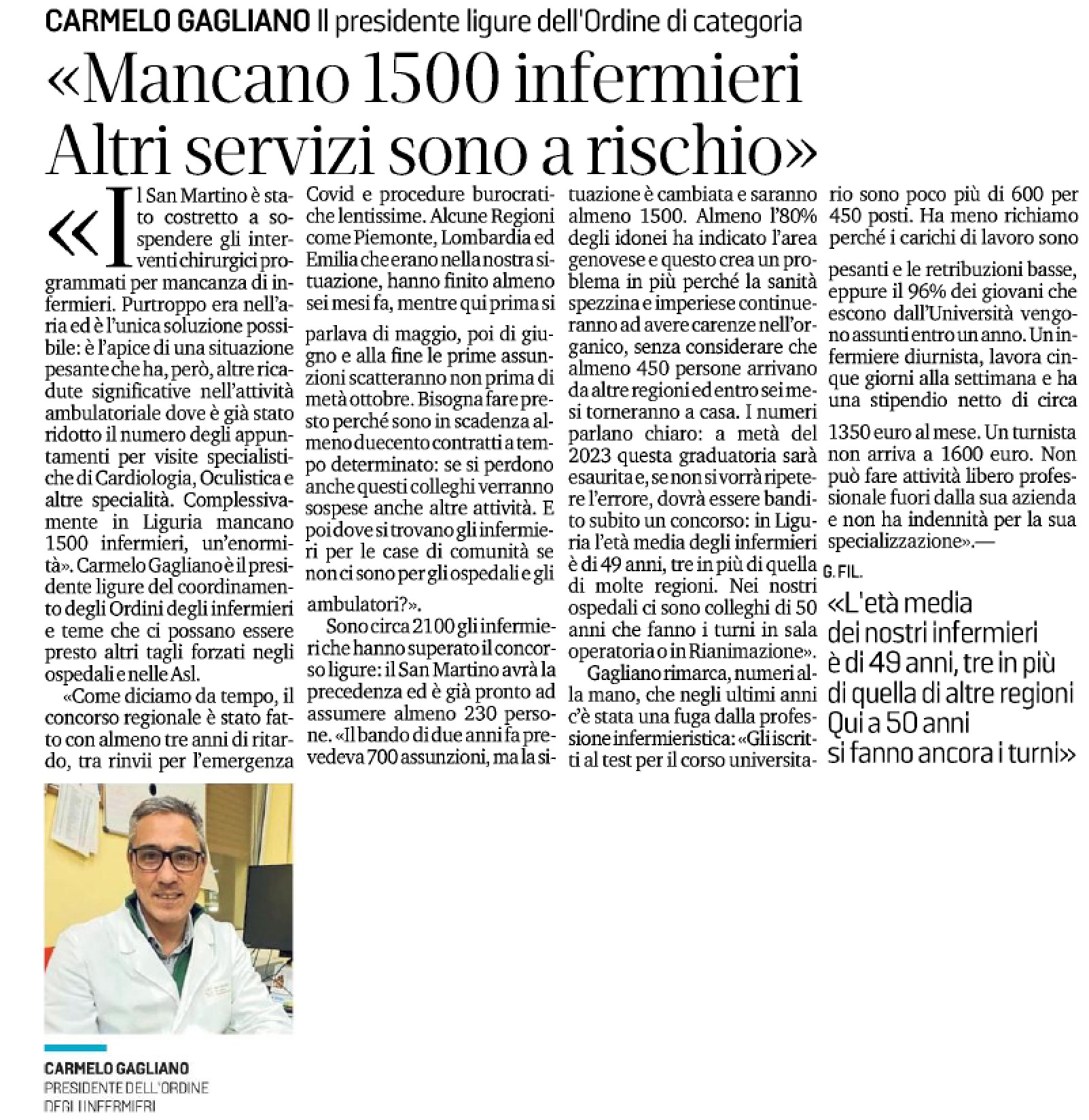 Articolo tratto da Secolo XIX del Presidente Gagliano in merito alla carenza degli Infermieri