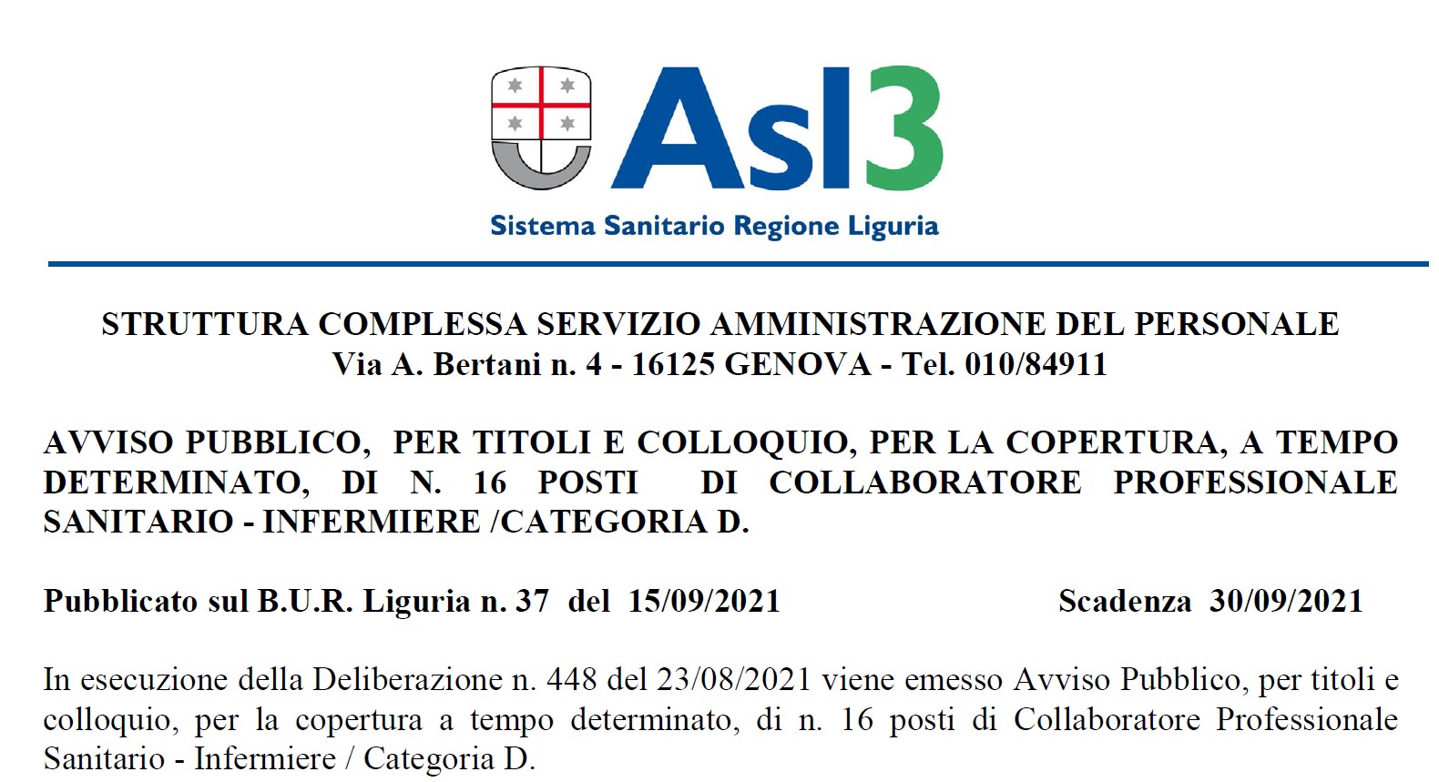 AVVISO PUBBLICO, PER TITOLI E COLLOQUIO, TEMPO DETERMINATO, 16 POSTI DI INFERMIERE