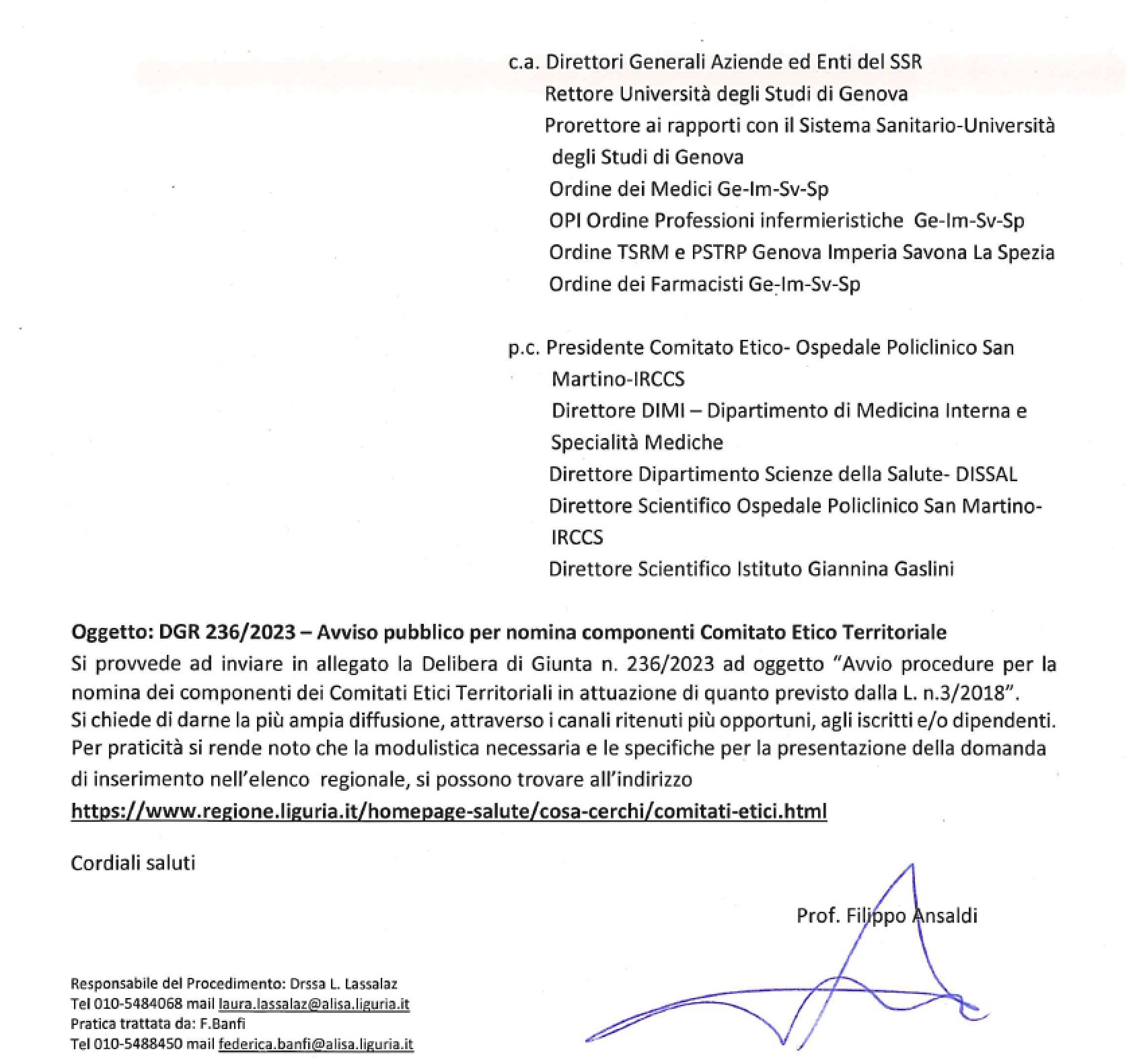 Avviso pubblico per nomina componenti Comitato Etico Territoriale