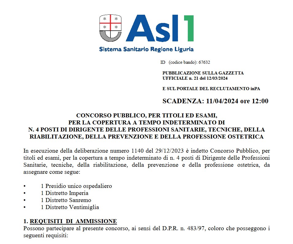 Bando di concorso per Dirigente delle profess. sanitarie, tecniche, della riabilitazione e ostetrica