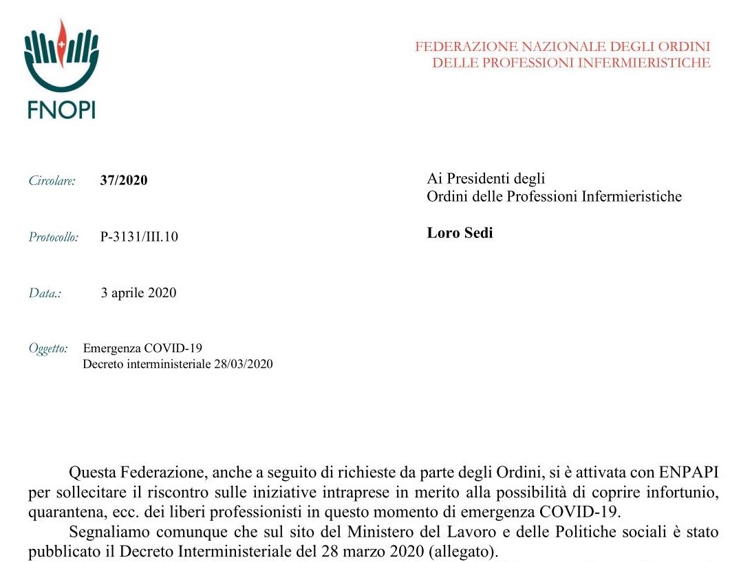 Circolare di Fnopi per infermieri libero professionisti