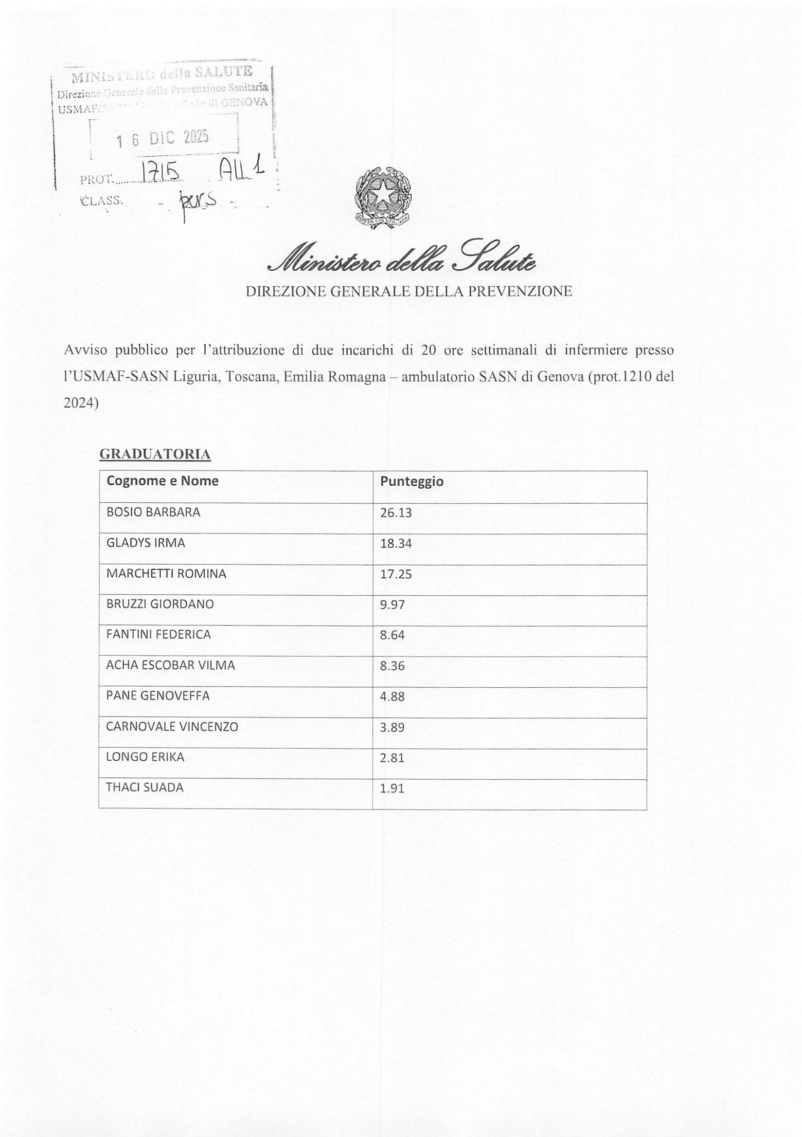 Graduatoria Avviso pubblico per Infermiere presso USMAF– SASN di Genova, 2 posti