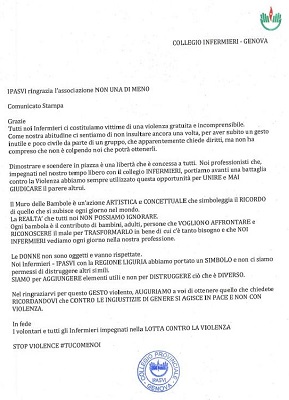 IPASVI ringrazia l'Associazione Non una di meno
