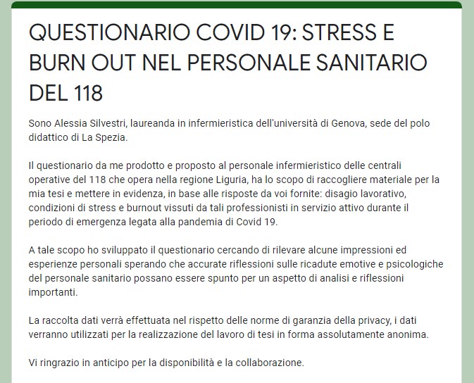 QUESTIONARIO COVID 19: STRESS E BURN OUT NEL PERSONALE SANITARIO DEL 118